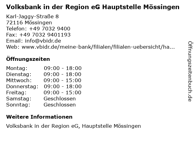 1 VR Bank eG Steinlach-Wiesaz-Härten - Hauptstelle Mössingen (Entfernung: 0,01 km) Karl-Jaggy-Straße 8, 72116 Mössingen 3 Volksbank in der Region eG Filiale Dußlingen (Entfernung: 4,92 km) Hindenburgplatz 6, 72144 Dußlingen 4 Volksbank in der Region eG, Filiale Gomaringen (Entfernung: 6,14 km) Bahnhofstraße 9, 72810 Gomaringen 6 Volksbank in der Region eG, SB-Stelle Poststraße in Rottenburg (Entfernung: 11,48 km) Poststraße 14, 72108 Rottenburg am Neckar |