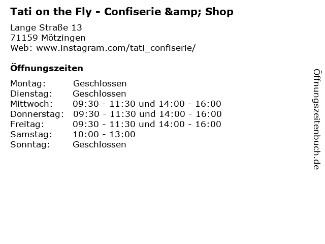 | Öffnungszeiten Tati on the Fly - Confiserie & Shop in Mötzingen anzeigen | |