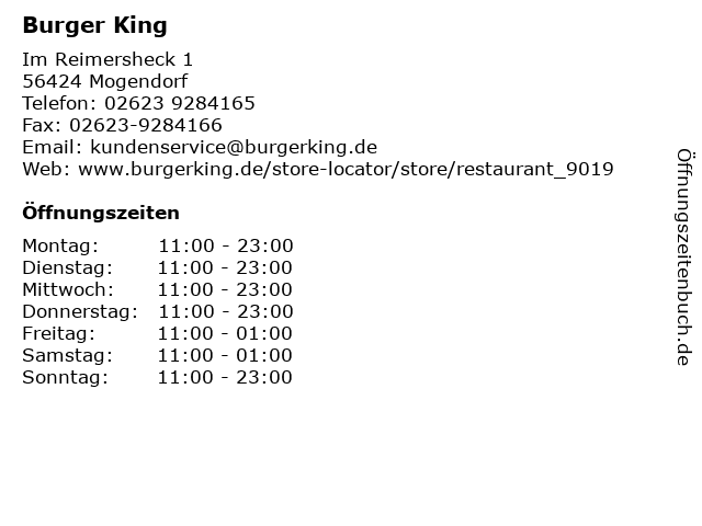 | Öffnungszeiten Burger King in Mogendorf anzeigen | |