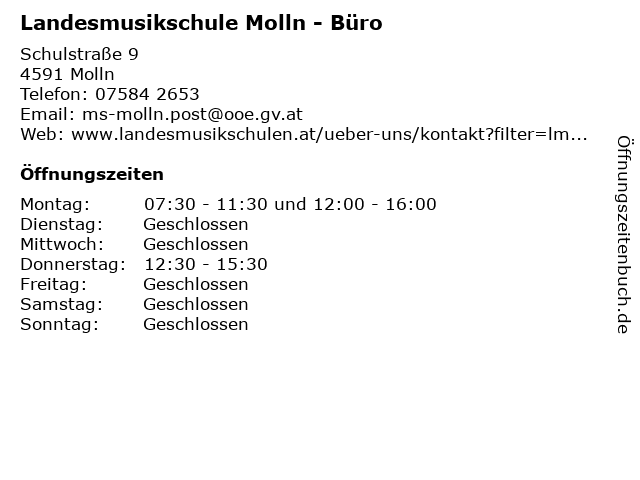 | Öffnungszeiten Landesmusikschule Molln - Büro in Molln anzeigen | |