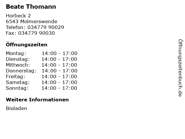 | Öffnungszeiten Beate Thomann in Molmerswende anzeigen | |