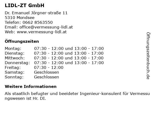 Öffnungszeiten LIDL-ZT GmbH in Mondsee anzeigen | |
