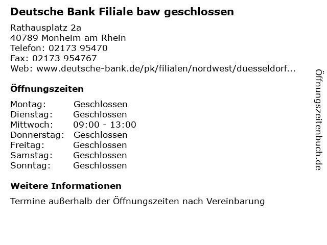 1 Deutsche Bank Filiale baw geschlossen (Entfernung: 16,54 km) Konrad-adenauer-straße 2, 42651 Solingen 6 |