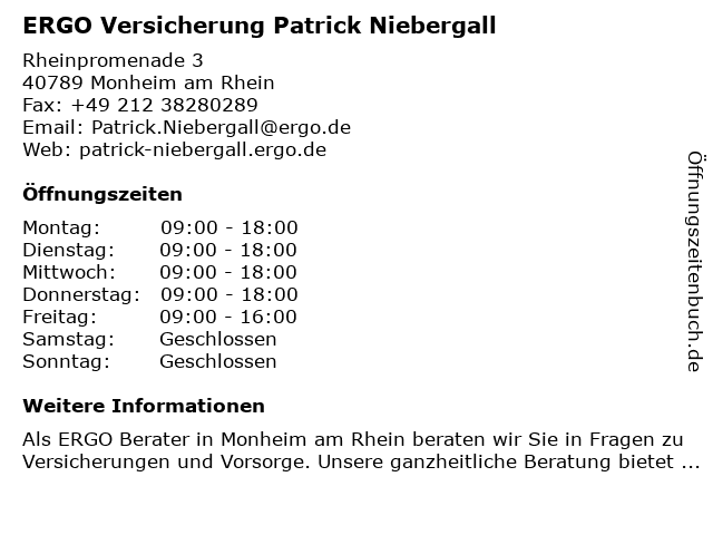 | Öffnungszeiten ERGO Versicherung Patrick Niebergall in Monheim am Rhein anzeigen | |