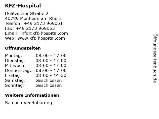 | Öffnungszeiten KFZ-Hospital in Monheim am Rhein anzeigen | |