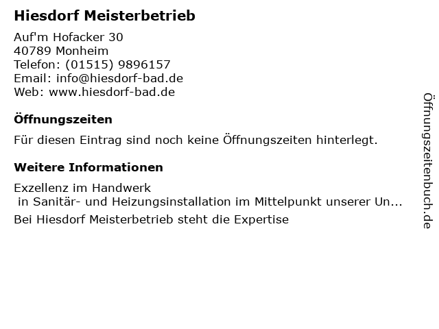 | Öffnungszeiten Hiesdorf Meisterbetrieb in Monheim anzeigen | |