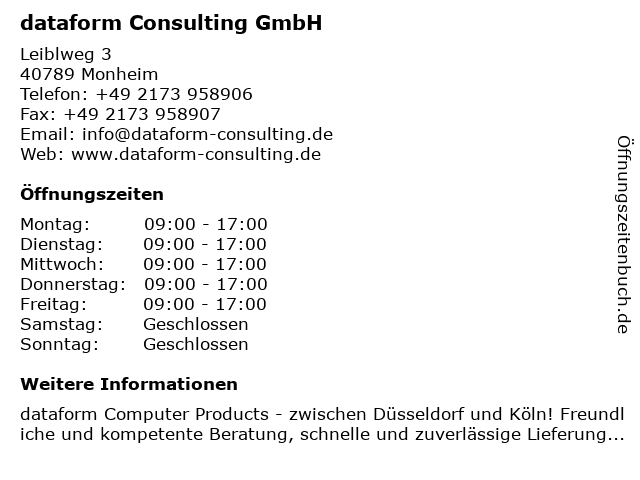 | Öffnungszeiten dataform Consulting GmbH in Monheim anzeigen | |
