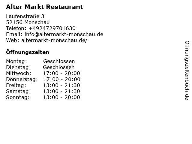 | Öffnungszeiten Alter Markt Restaurant in Monschau anzeigen | |
