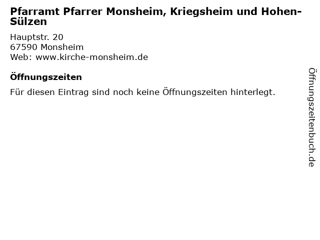 | Öffnungszeiten Pfarramt Pfarrer Monsheim, Kriegsheim und Hohen-Sülzen in Monsheim anzeigen | |