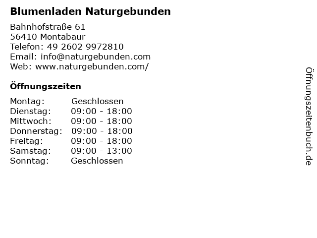 | Öffnungszeiten Blumenladen Naturgebunden in Montabaur anzeigen | |