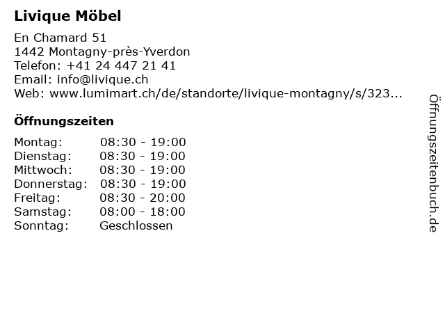 | Öffnungszeiten Livique Möbel in Montagny-près-Yverdon anzeigen | |
