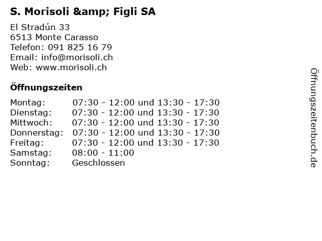 | Öffnungszeiten S. Morisoli & Figli SA in Monte Carasso anzeigen | |