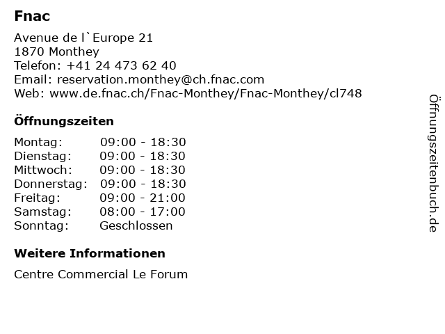 | Öffnungszeiten Fnac in Monthey anzeigen | |