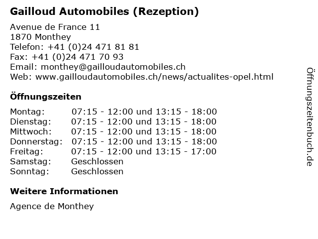 2 Gailloud Automobiles (Werkstatt, Werk, Karosseriebau) (Entfernung: 0,00 km) Avenue de France 11, 1870 Monthey 6 |