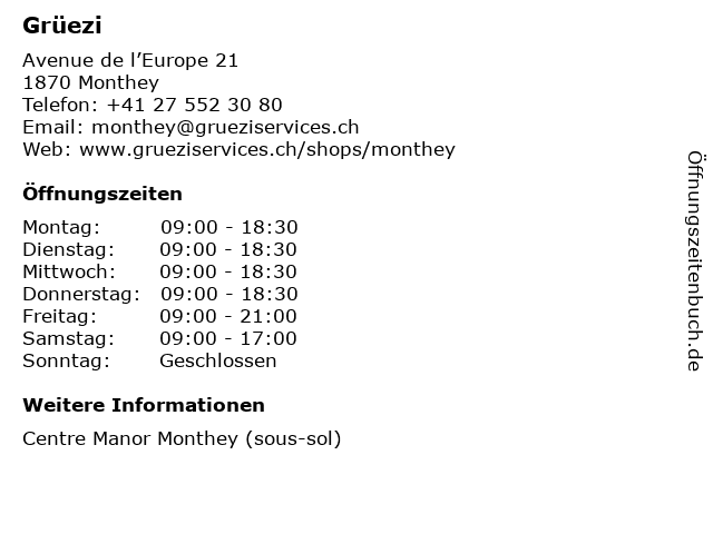| Öffnungszeiten Grüezi in Monthey anzeigen | |
