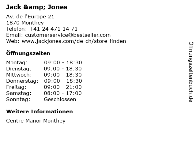 | Öffnungszeiten Jack & Jones in Monthey anzeigen | |