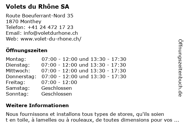 | Öffnungszeiten Volets du Rhône SA in Monthey anzeigen | |