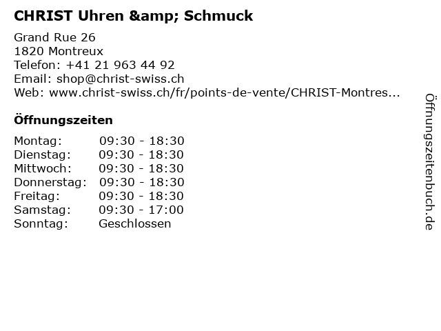 | Öffnungszeiten CHRIST Uhren & Schmuck in Montreux anzeigen | |