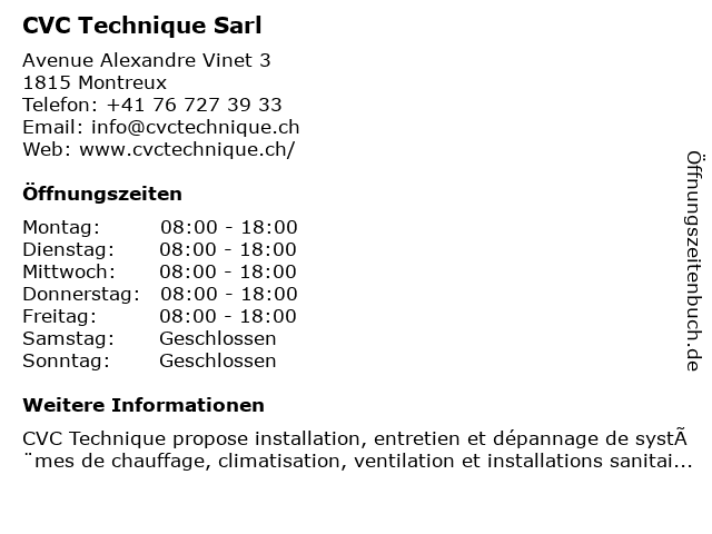 | Öffnungszeiten CVC Technique Sarl in Montreux anzeigen | |