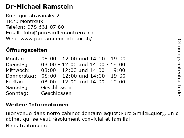 | Öffnungszeiten Dr-Michael Ramstein in Montreux anzeigen | |