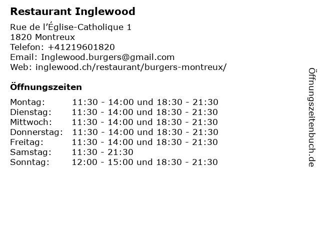 | Öffnungszeiten Restaurant Inglewood in Montreux anzeigen | |