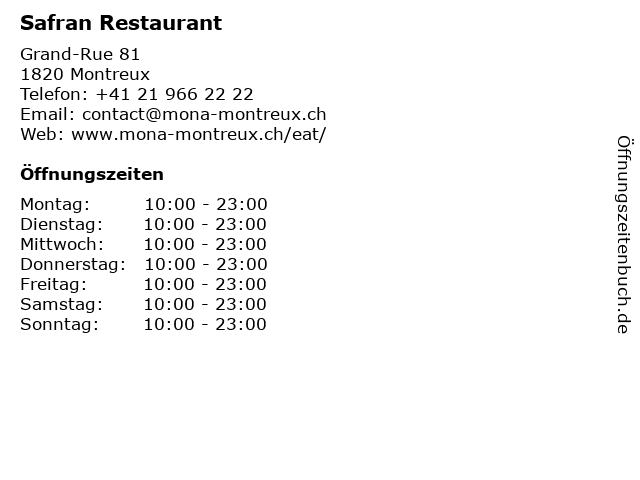 | Öffnungszeiten Safran Restaurant in Montreux anzeigen | |