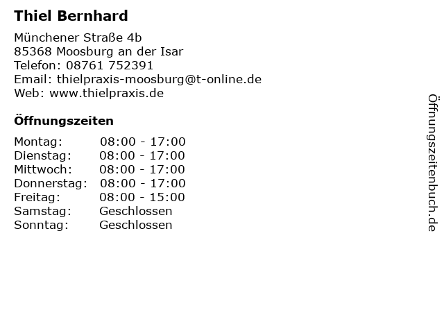 | Öffnungszeiten Thiel Bernhard in Moosburg an der Isar anzeigen | |