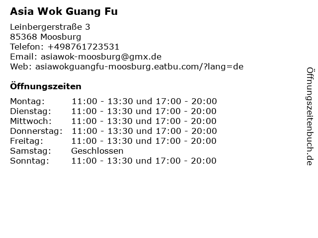 | Öffnungszeiten Asia Wok Guang Fu in Moosburg anzeigen | |