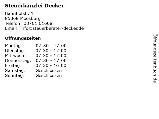 | Öffnungszeiten Steuerkanzlei Decker in Moosburg anzeigen | |