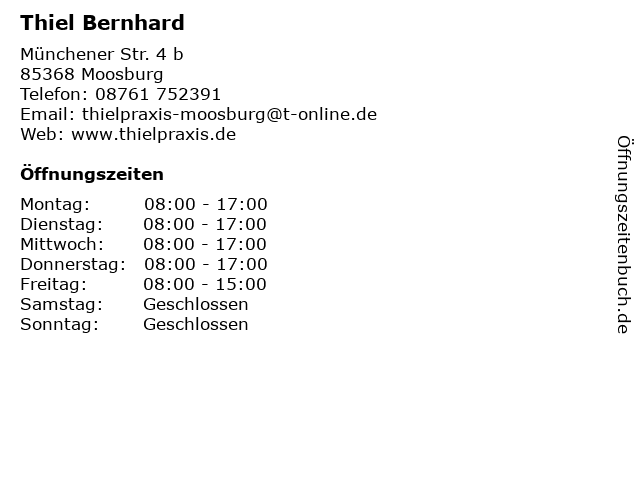 | Öffnungszeiten Thiel Bernhard in Moosburg anzeigen | |