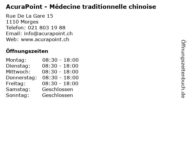 2 VITATEC Médecine Technique Sàrl (Entfernung: 7,02 km) Chemin de Cocagne 51, 1030 Bussigny-près-Lausanne 4 Centre de médecine traditionnelle chinoise de Lausanne (Entfernung: 10,27 km) rue Petit-Chêne 38, 1003 Lausanne 5 Sinomedica Acupuncture Médicale et Médecine Traditionelle Chinoise Lausanne (Entfernung: 10,61 km) Place Saint-François 5, 1003 Lausanne 6 |