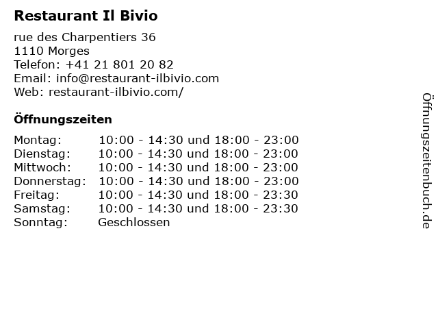 | Öffnungszeiten Restaurant Il Bivio in Morges anzeigen | |