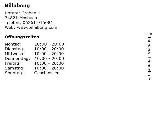 | Öffnungszeiten Billabong in Mosbach anzeigen | |