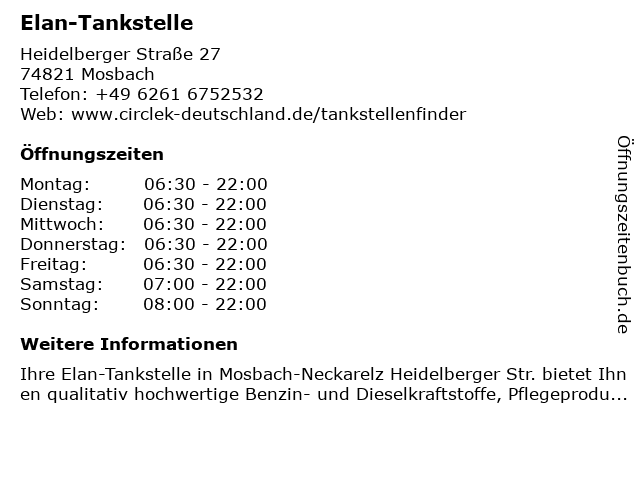 Öffnungszeiten Elan-Tankstelle in Mosbach anzeigen | |