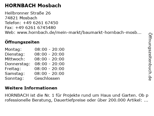 | Öffnungszeiten HORNBACH Mosbach in Mosbach anzeigen | |