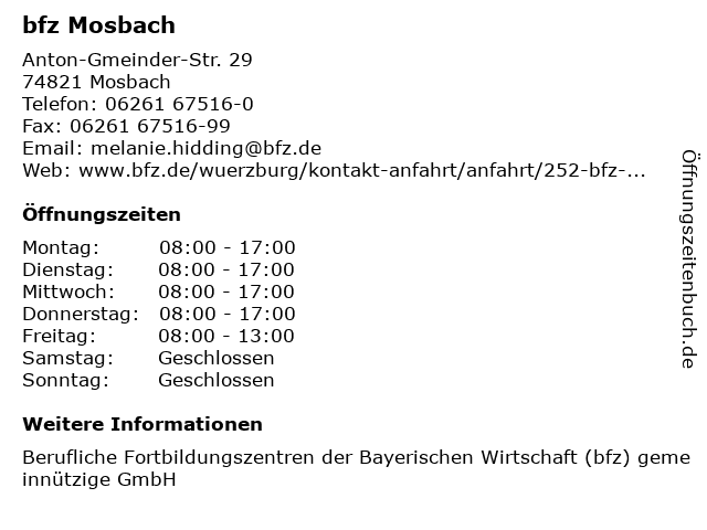 | Öffnungszeiten bfz Mosbach in Mosbach anzeigen | |