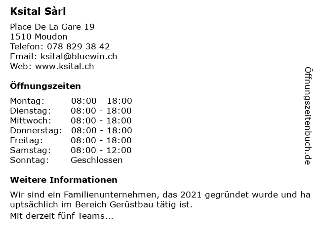 | Öffnungszeiten Ksital Sàrl in Moudon anzeigen | |