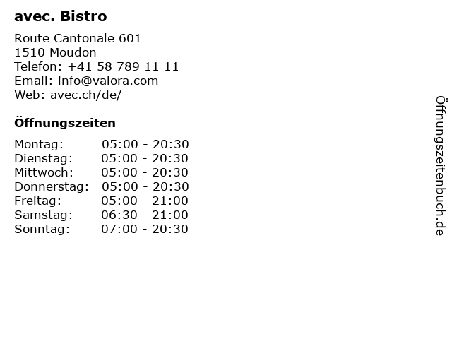 | Öffnungszeiten avec. Bistro in Moudon anzeigen | |