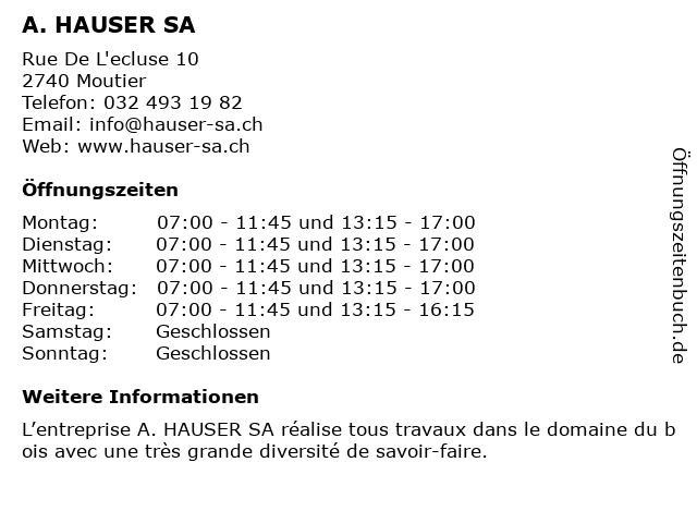 | Öffnungszeiten A. HAUSER SA in Moutier anzeigen | |
