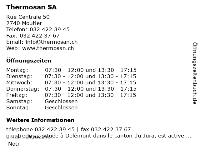 | Öffnungszeiten Thermosan SA in Moutier anzeigen | |