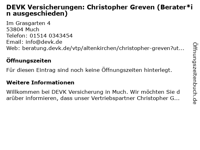 | DEVK Versicherungen: Christopher Greven (Berater*in ausgeschieden) anrufen | |
