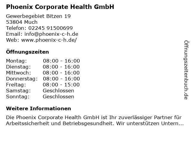 | Öffnungszeiten Phoenix Corporate Health GmbH in Much anzeigen | |