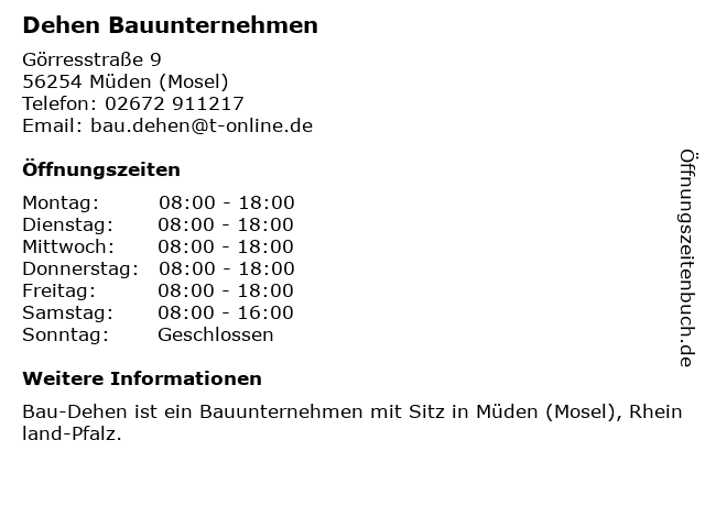 | Öffnungszeiten Dehen Bauunternehmen in Müden (Mosel) anzeigen | |