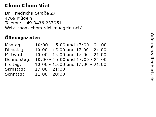 | Öffnungszeiten Chom Chom Viet in Mügeln anzeigen | |
