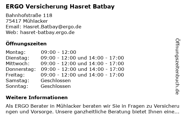 | Öffnungszeiten ERGO Versicherung Hasret Batbay in Mühlacker anzeigen | |