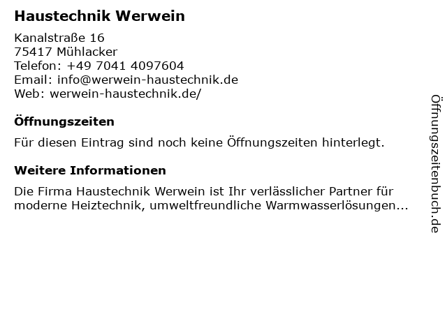 | Öffnungszeiten Haustechnik Werwein in Mühlacker anzeigen | |