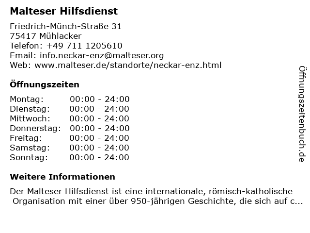 | Öffnungszeiten Malteser Hilfsdienst in Mühlacker anzeigen | |
