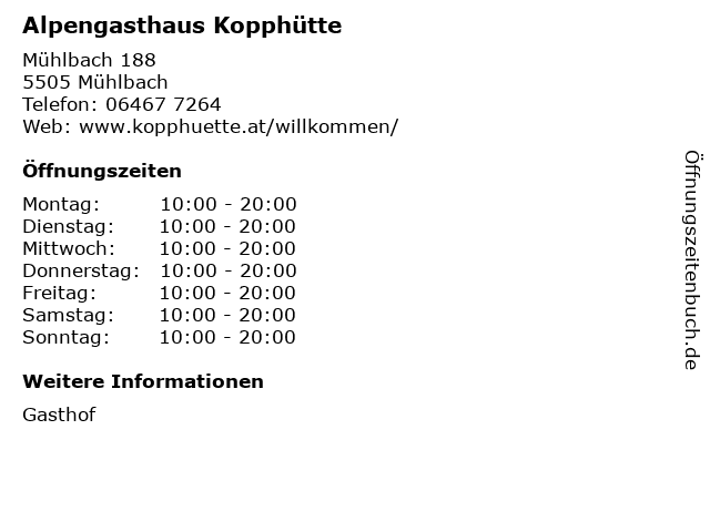 | Öffnungszeiten Alpengasthaus Kopphütte in Mühlbach anzeigen | |