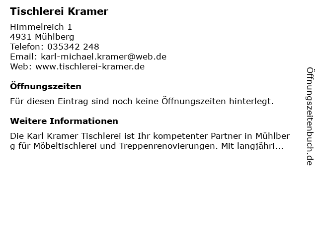 | Öffnungszeiten Tischlerei Kramer in Mühlberg anzeigen | |