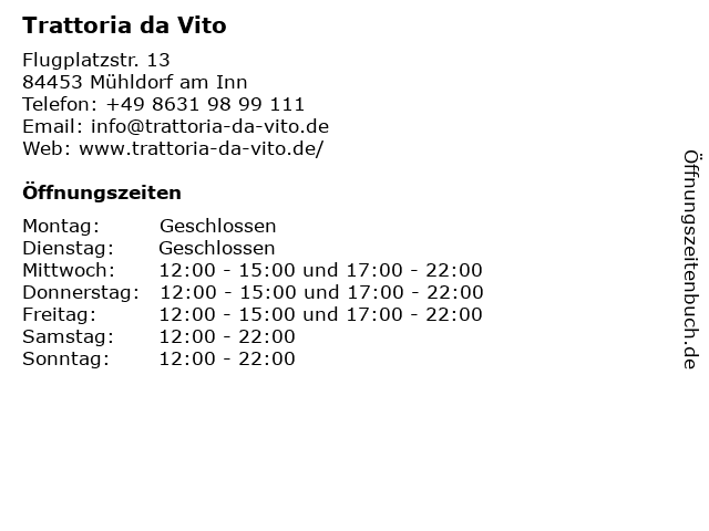 | Öffnungszeiten Trattoria da Vito in Mühldorf am Inn anzeigen | |